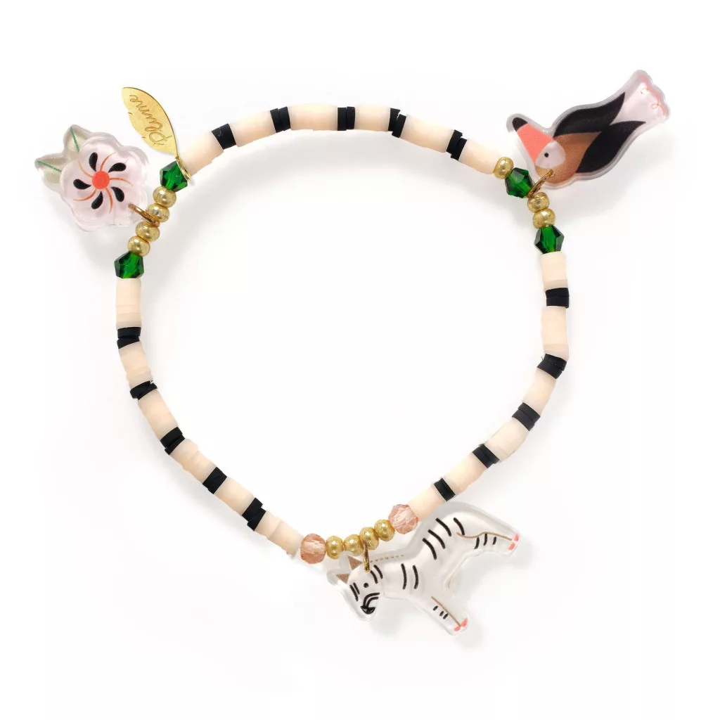 Fedezd fel a dzsungel varázsát Jemma dzsungel karkötőjével! Ez az izgalmas, dzsungel ihlette karkötő kalandra csábít. Az akrilgyöngyökkel és három különleges medállal díszített ékszer - egy zebra, egy virág és egy tukan – egyedi, egzotikus és színes megjelenést kölcsönöz a csuklódnak.