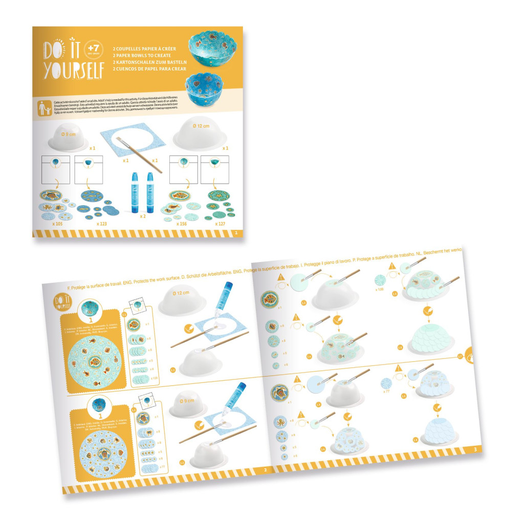 Mi mindenre lesz szükséged? A csomag tartalmaz két különböző méretű tálat (9 x 5,5 cm és 12 x 6 cm), két tubus folyékony ragasztót, egy palettát, egy ecsetet, illusztrált papírkonfettit és egy részletes, lépésről lépésre haladó útmutatót. Az egész folyamat rendkívül egyszerű: csak ragaszd a konfettiket a tál formáira a folyékony ragasztó segítségével, először a belső, majd a külső oldalára, hagyják megszáradni, és máris készen állnak a használatra!